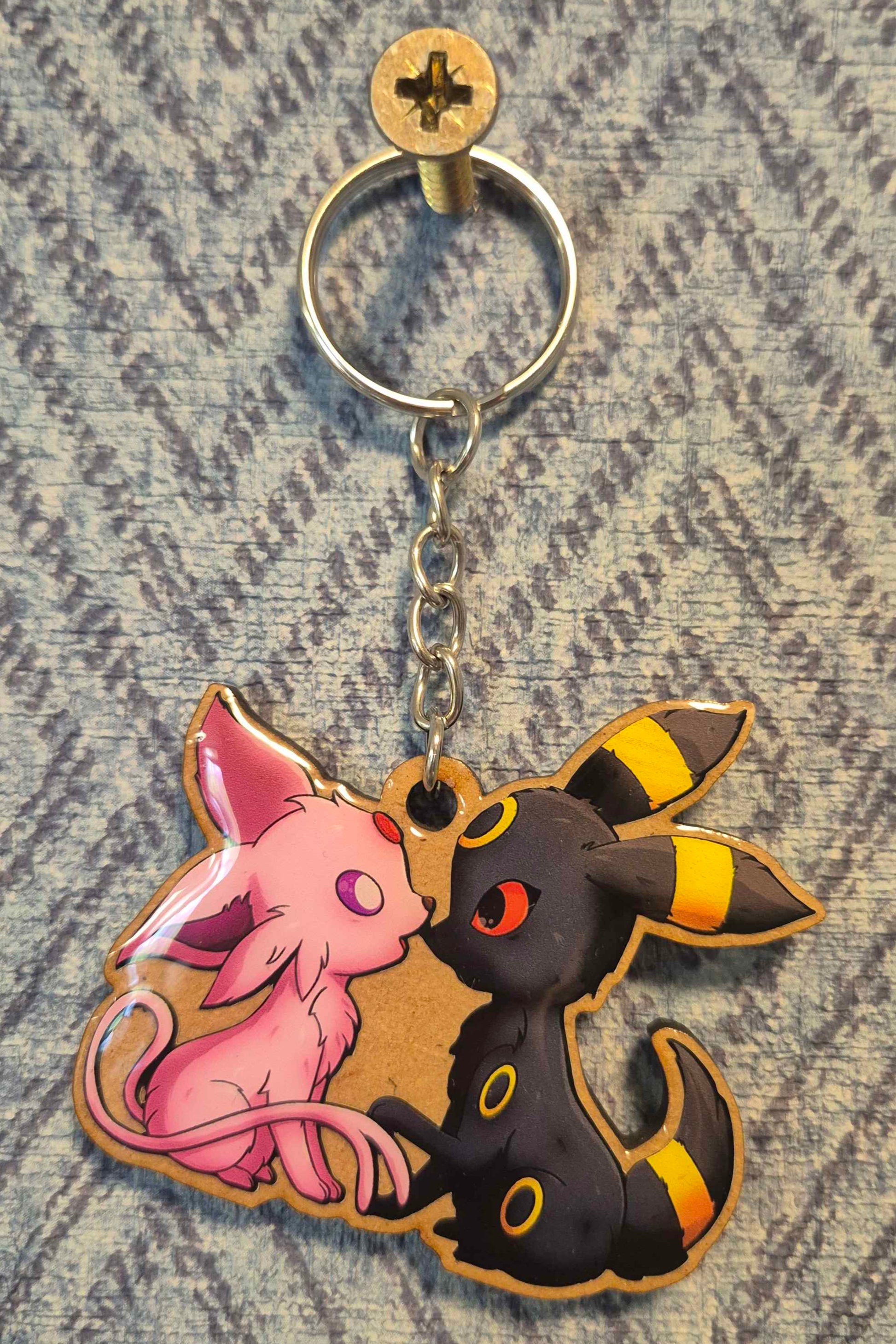 This enchanting wooden keyring features a resin print of my original artwork β two mystical, fox-like creatures with contrasting light and dark fur, gently touching noses and gazing into each otherβs eyes β¨π«