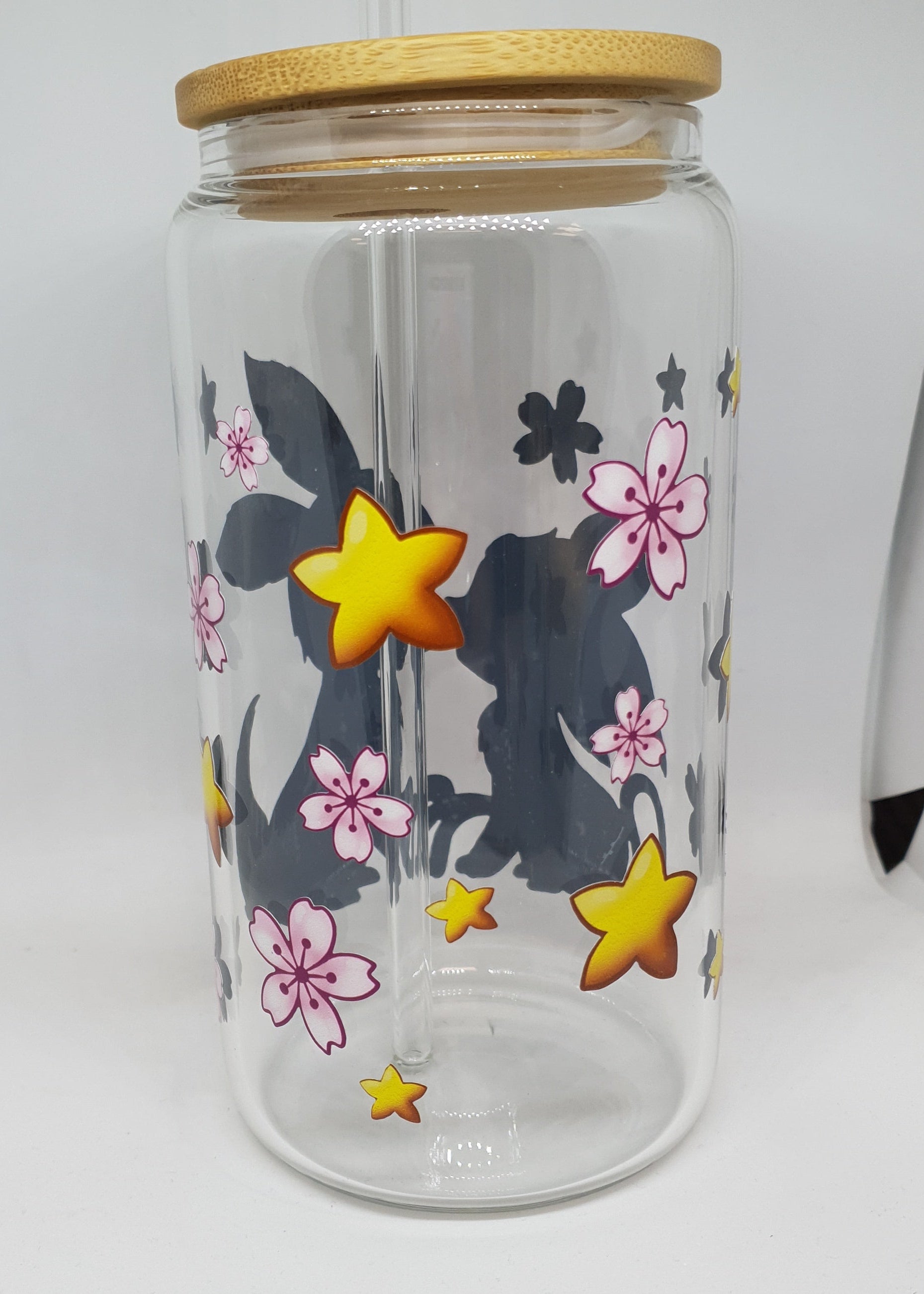 Surrounding them, a cascade of soft blossom flowers and yellow stars wraps around the entire glass β like a constellation of flowers dancing across the sky.