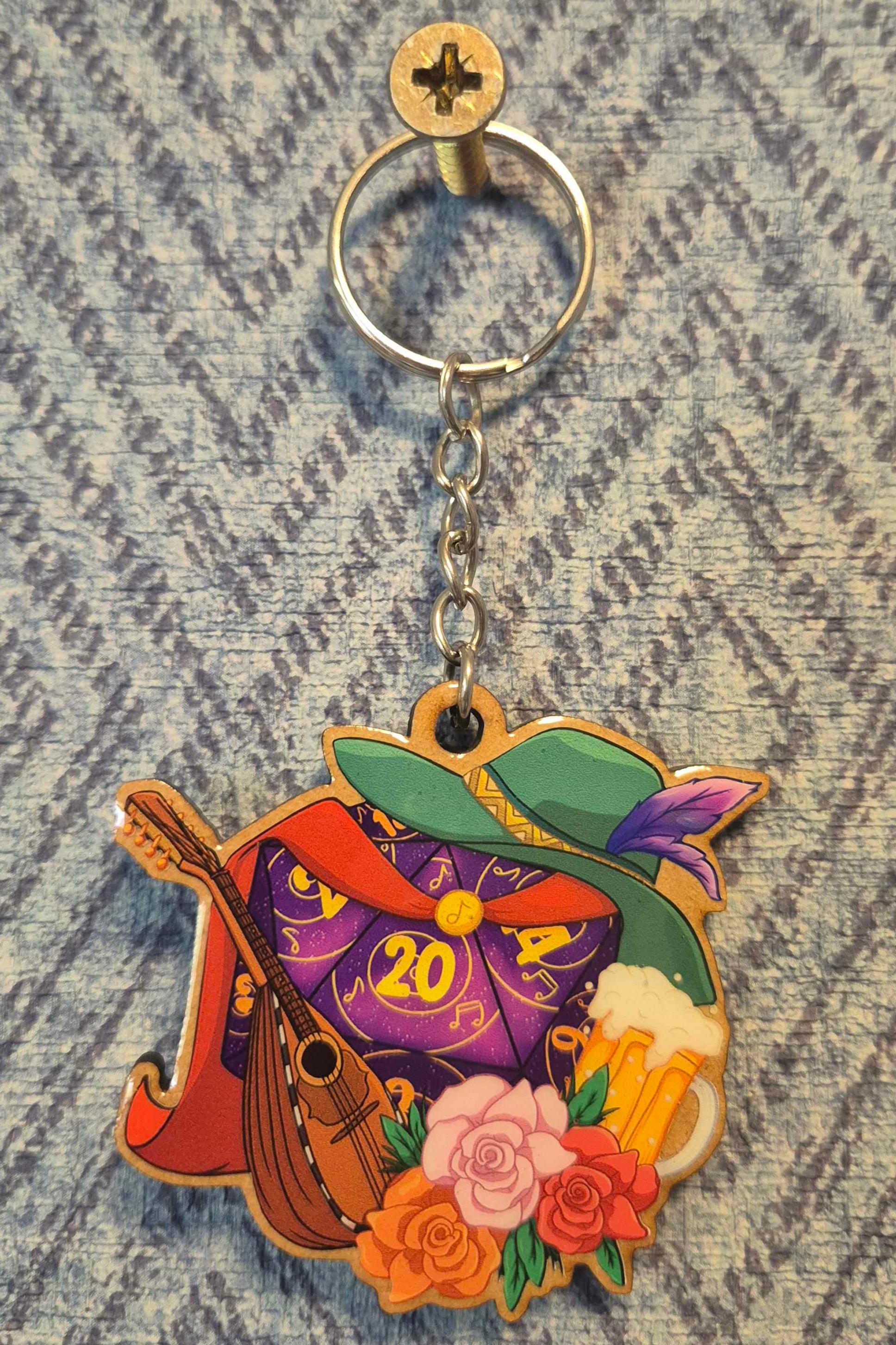 Roll for drama! This fantasy-inspired wooden keyring features a resin print of my original artwork - a glorious purple and gold 20-sided dice, rolled proudly on a natural 20 🎉