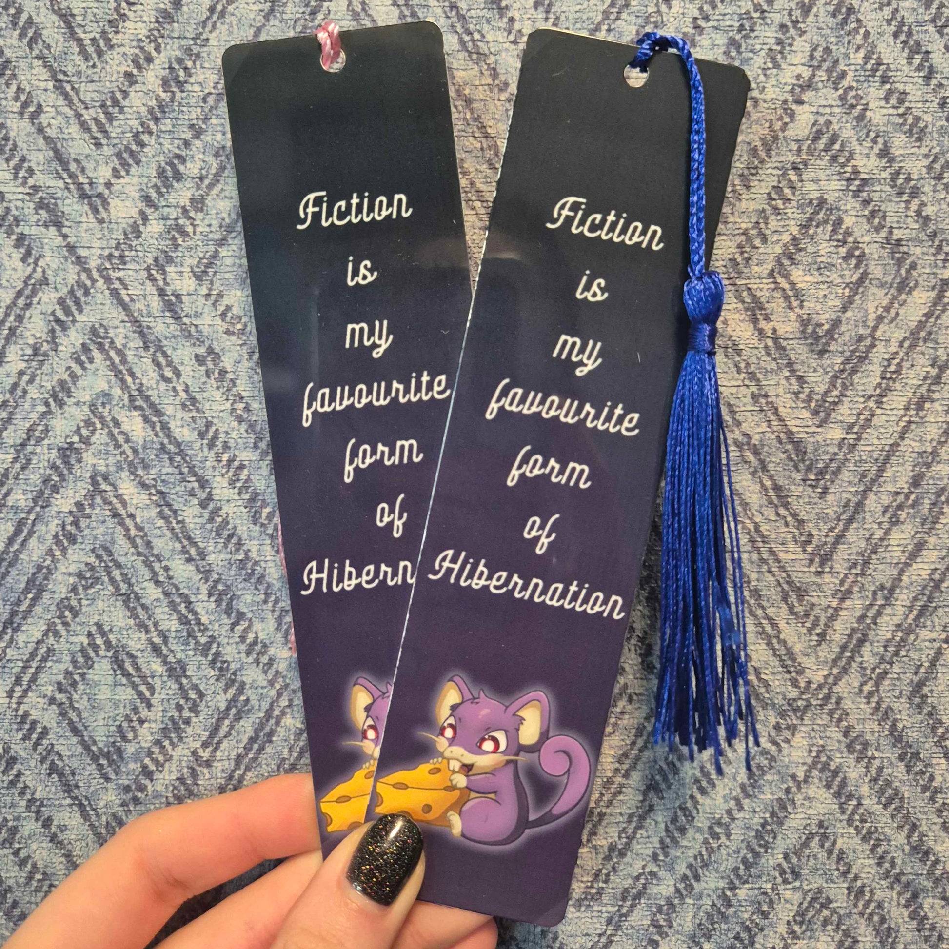 Curl up with a good book and this cosy little reading companion. This metal bookmark features an adorable rat happily nibbling a wedge of cheese, with the words “Fiction is my favourite form of hibernation” written above.
