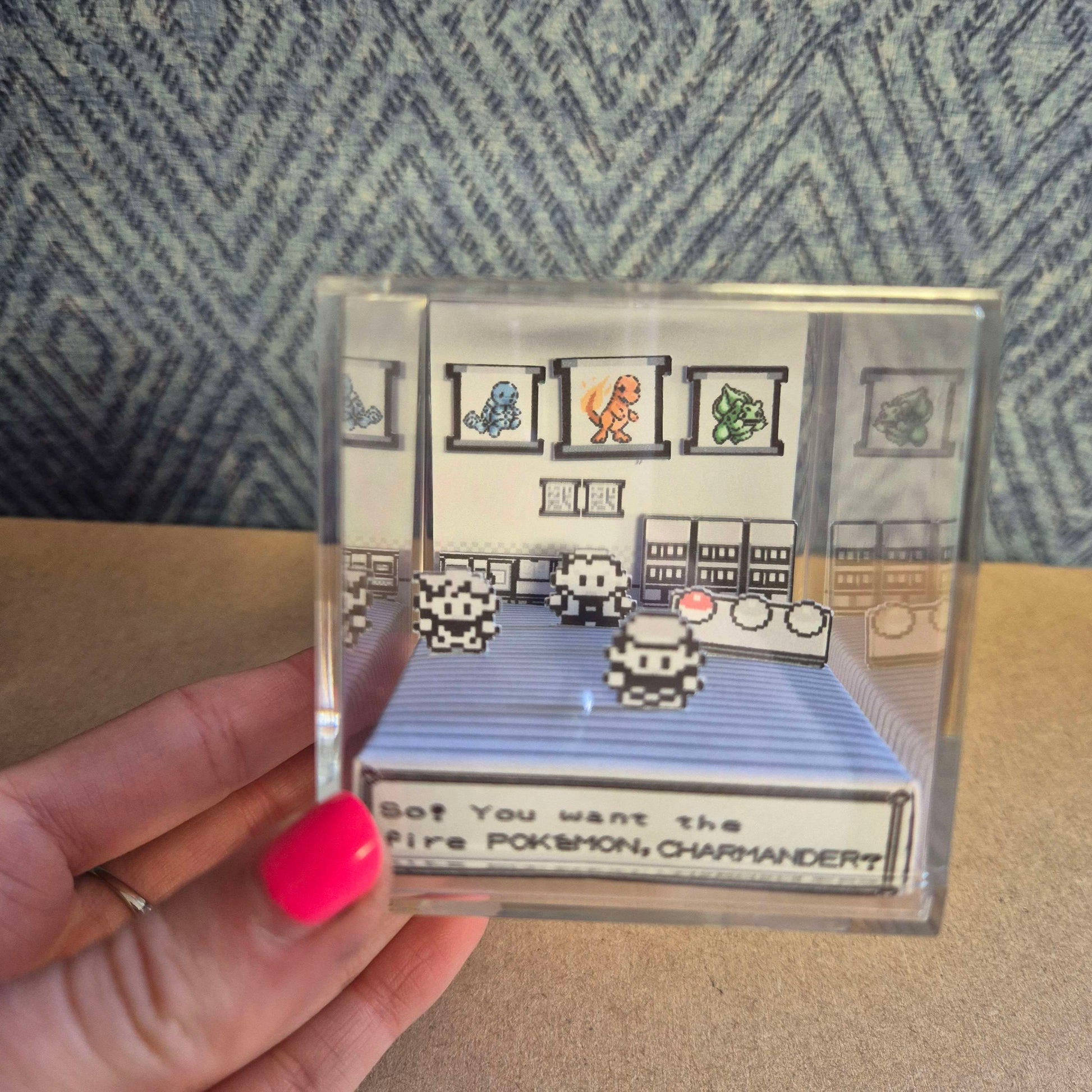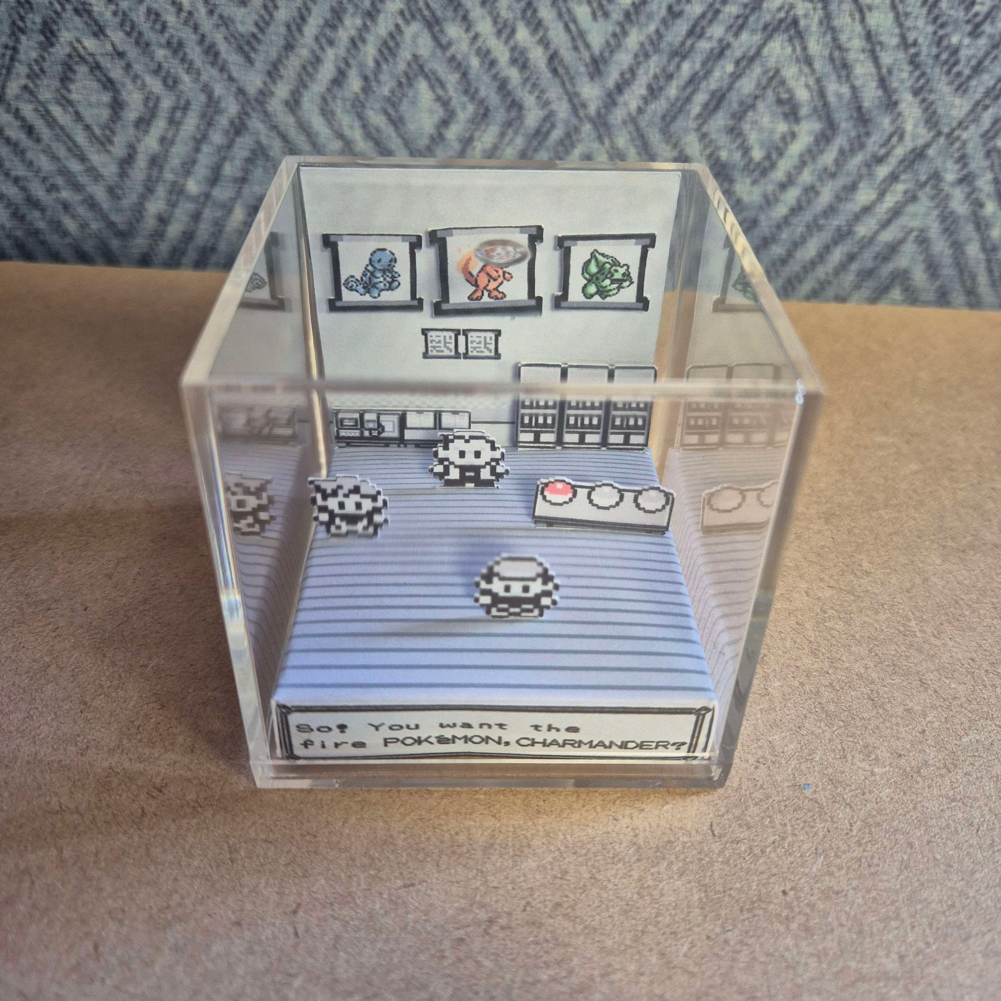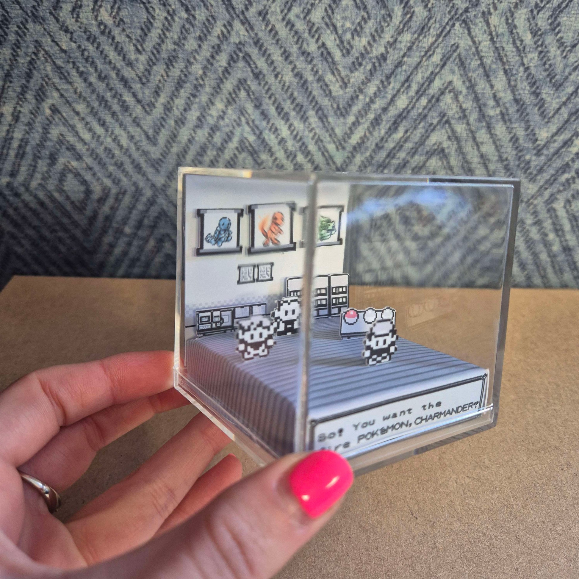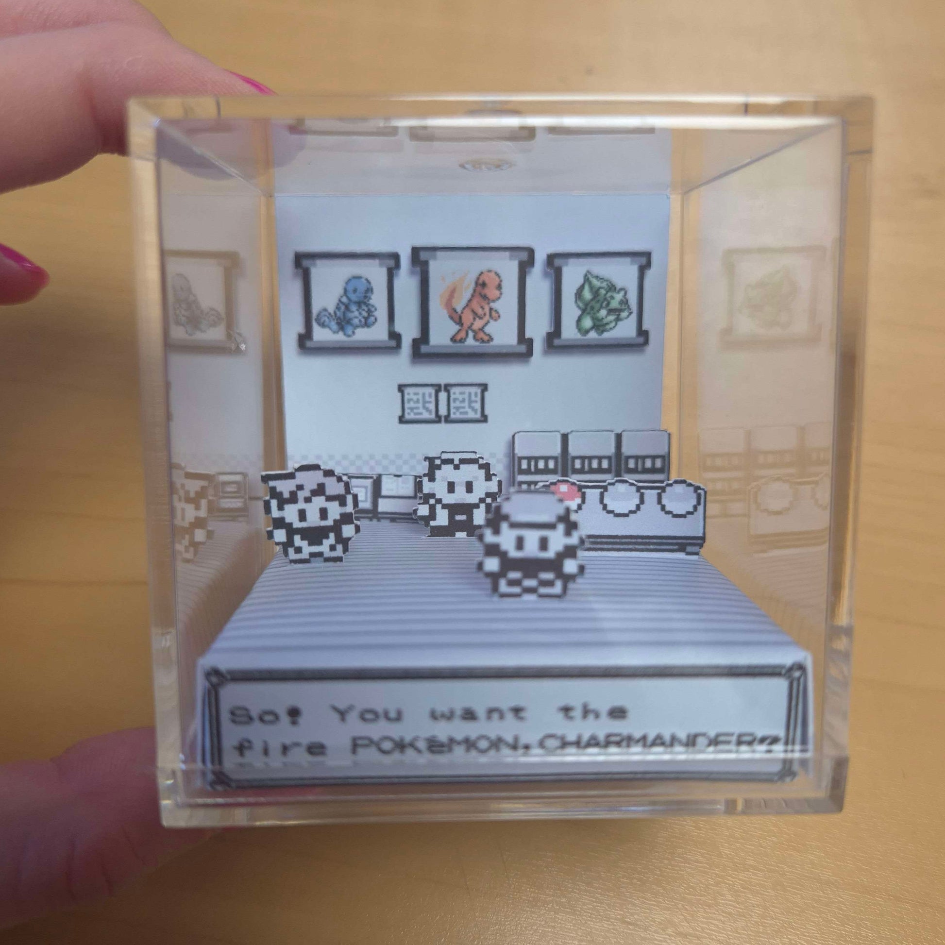 This 6.5cm sq mini diorama recreates a familiar pixel-perfect lab scene: three tiny companions wait on their pedestals, ready to join you on your very first adventure.