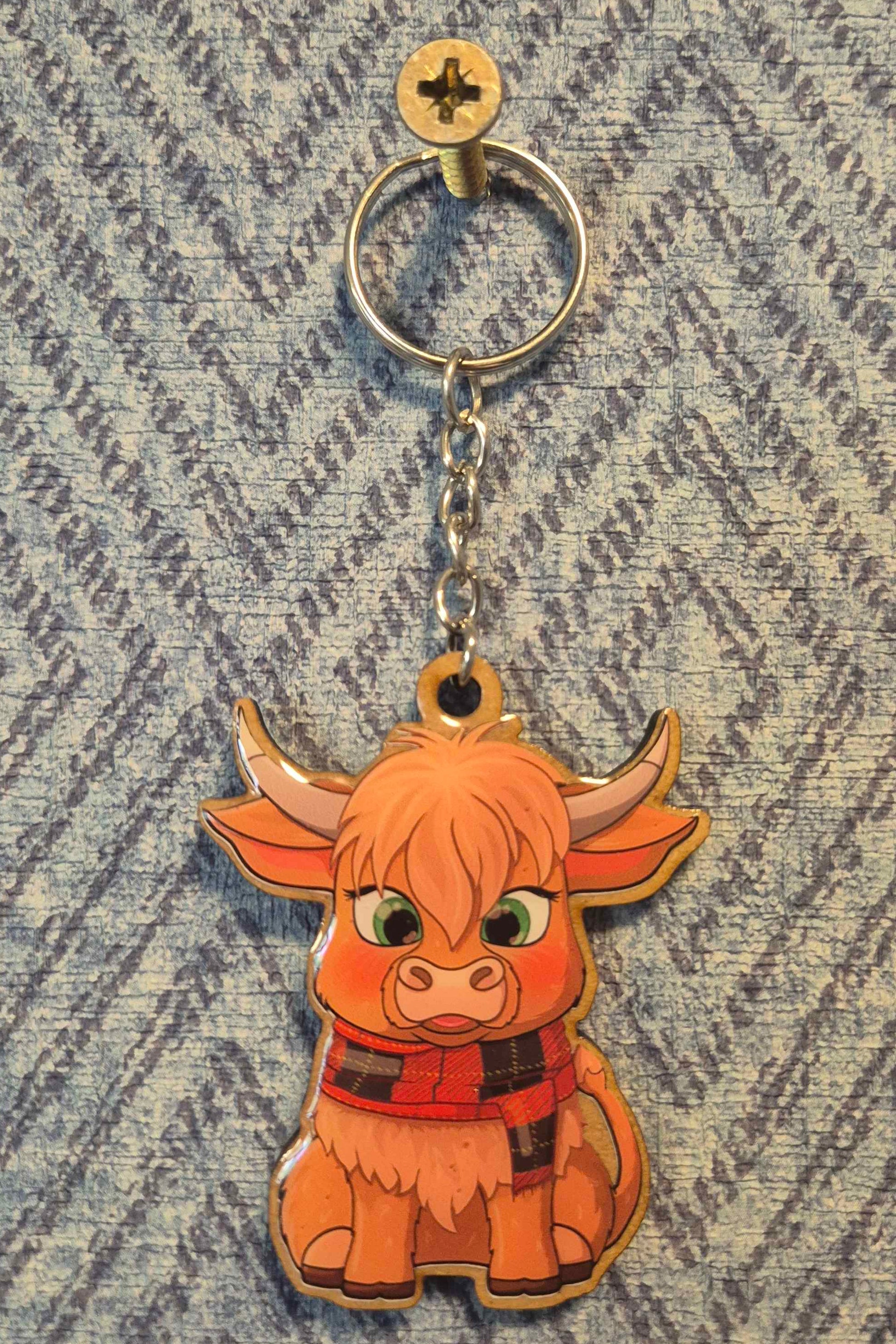 This wooden keyring features a resin print of my hand-drawn character, a fluffy Scottish Highland cow proudly rocking his signature red tartan scarf. He’s soft, scruffy, and full of cozy autumnal charm 🍁