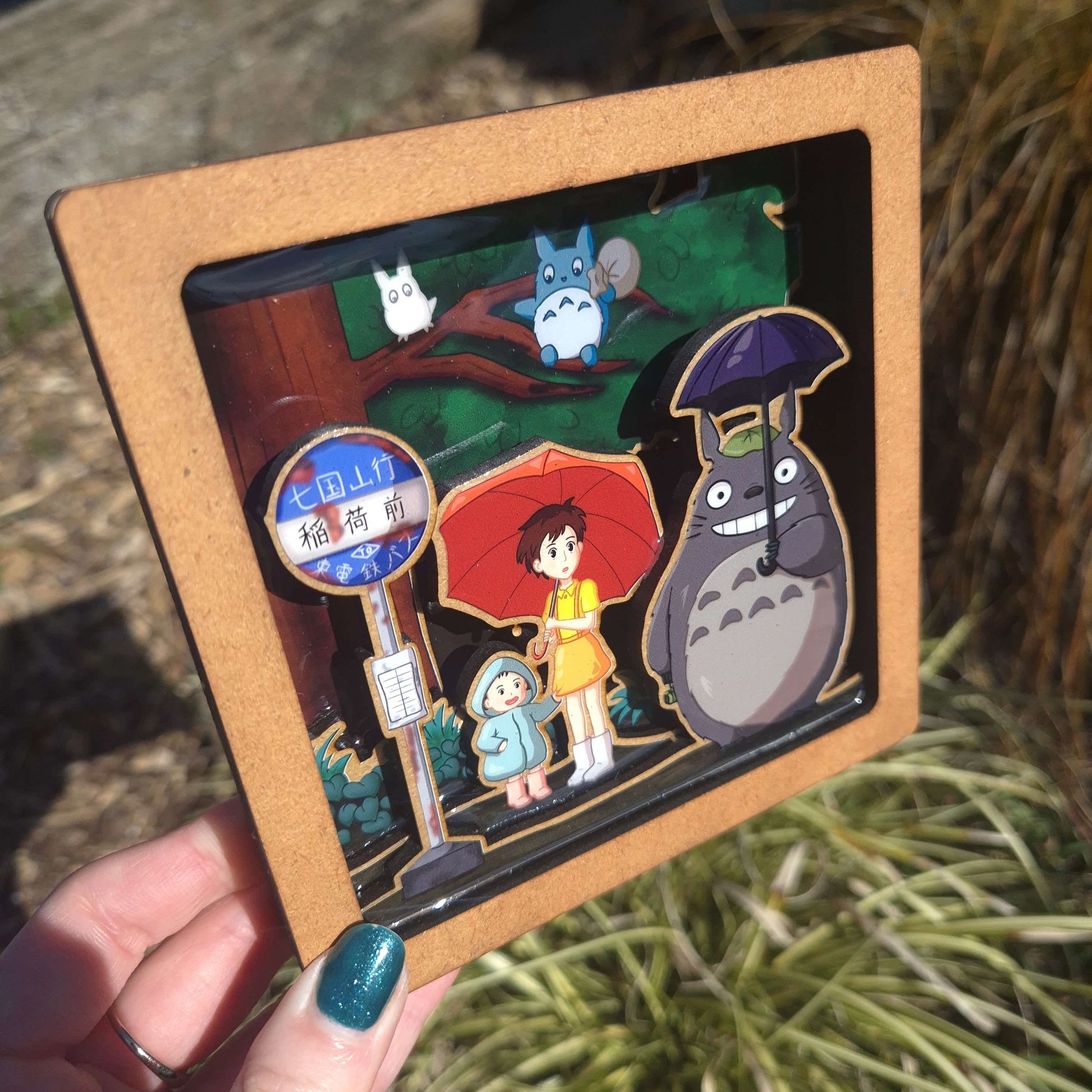 This 12x12cm handmade diorama captures a beloved forest spirit standing beside a two girls at a rainy roadside stop. With glossy resin, hand-drawn details, and that unmistakable umbrella scene, it’s a tribute to calm, connection, and a little bit of wonder waiting in the dark.