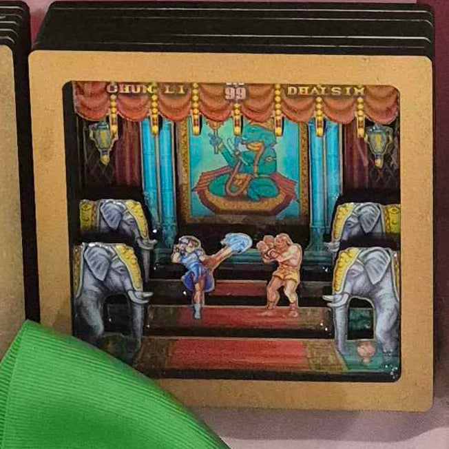 Handmade in house, this 12x12cm wooden layered diorama captures a moment mid-battle - two skilled fighters trading blows beneath ornate arches, watched by gleaming golden elephants.
